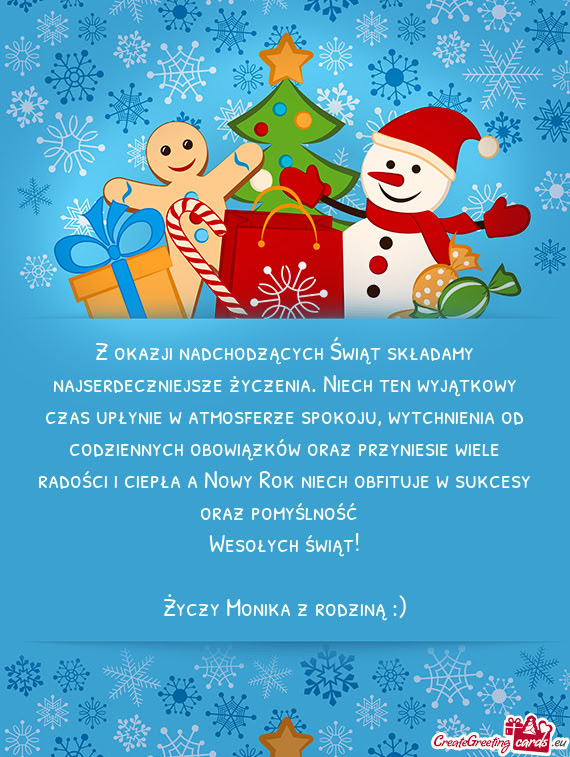 Dużo zdrowia i radości w Twoim życiu niech zagości i prezęty i śnieg biały By te święta urok miały