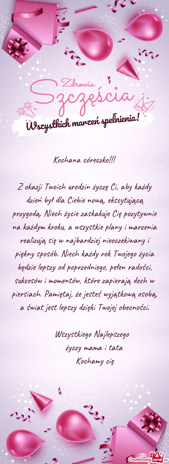 W dniu tak pięknym i wspaniałym życzymy Tobie sercem całym zdrowia, szczęścia, pomyślności, sto lat życia i radości. Być może masz i inne życzenia, więc też życzymy ich spełnienia.