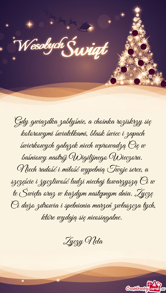 W tej szczególnej świątecznej porze życzę Wam aby magiczna moc wigilijnego wieczoru przyniosła Wam wewnętrzny spokój, chwilę oddechu, szczęśliwe chwile spędzone z najbliższymi, wspaniałą atmosferę wypełnioną śmiechem i wspomnieniami, zdrowie oraz co najważniejsze, niech ta noc przyniesie Wam miłość, która rozświetli każdy zakątek Waszego domu i serca.