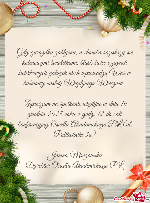 Z okazji Świąt Bożego Narodzenia, składam serdeczne życzenia.Niech Wam Święta miłe będą, dźwiękiem śpiewu i kolędą.Z Wigilią tuż po zmroku i w radosnym Nowym Roku.