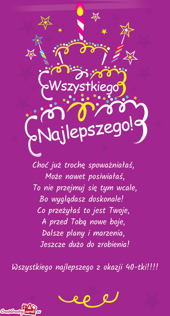 Z okazji urodzin składamy Ci moc życzeń: uśmiechu, zdrowia, radości, mnóstwa prezentów i gości, przyjaźni wielkich i małych, wielu przygód niebywałych i uśmiechu wesołego i wszystkiego, wszystkiego najlepszego!