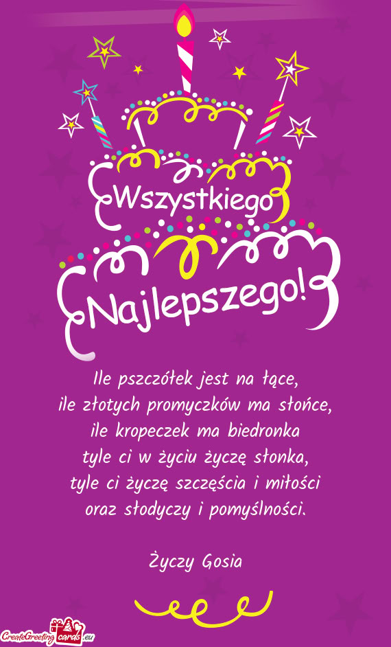 Z okazji urodzin składam Ci moc życzeń: uśmiechu, zdrowia, radości, mnóstwa prezentów i gości, przyjaźni wielkich i małych, wielu przygód niebywałych i uśmiechu wesołego i wszystkiego, wszystkiego najlepszego!