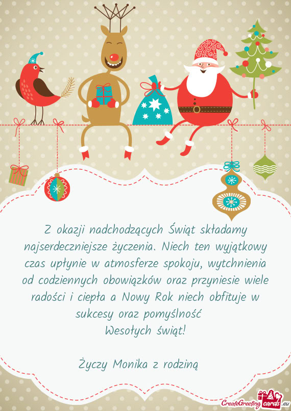 Zdrowych i spokojnych Świąt Bożego Narodzenia Pełnych spokoju i rodzinnego ciepła, a także szczęśliwych chwil, sukcesów i pomyślności w Nowym Roku rodzicom i dzieciom życzy