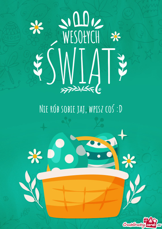 Spokojnych i Radosnych Świąt Wielkanocnych, miłych chwil wśród Bliskich, smacznych potraw, pogoŻYCZĄ PRACOWNICY WYDZIAŁU PODATKOWEGOKurator Okręgowy Sądu OkręgowegoZespół Wrocławskiego Centrum OkulistycznegoInspektoratu Ochrony Środowiska w Poznaniu oraz Delegaturami w Kaliszu, Koninie, Lesznie i PileCudownych chwil, wytchnienia od codziennego pędu, myśli skoncentrowanych na bliskich i atmosfery s