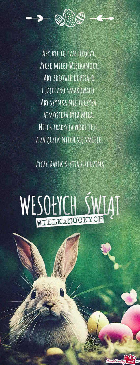 Same życzenia to jednak nie wszystko, co można znaleźć w poniższej kategorii. Zamieściliśmy w niej również wiele interesujących kartek wielkanocnych, które także odznaczają się sporym zróżnicowaniem i dostępne są w najróżniejszych stylach. Wystarczy jedynie wybrać odpowiednie dla siebie życzenia, aby następnie bez problemu umieścić je na wskazanej kartce. Tak przygotowany prezent można od razu wysłać drugiej osobie lub zamieścić na dowolnym portalu społecznościowym.